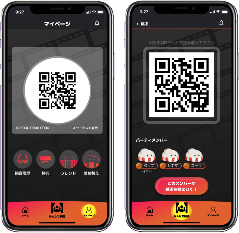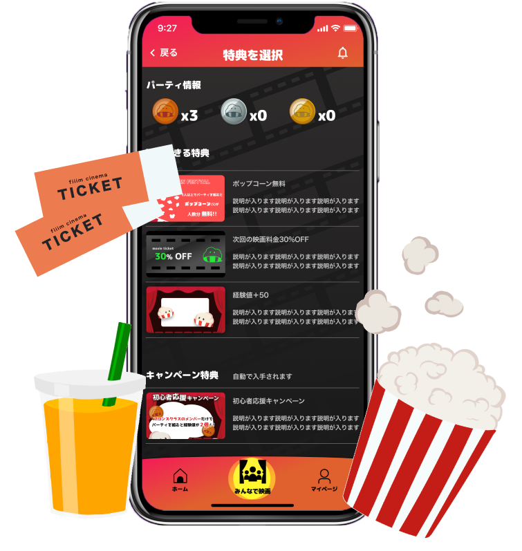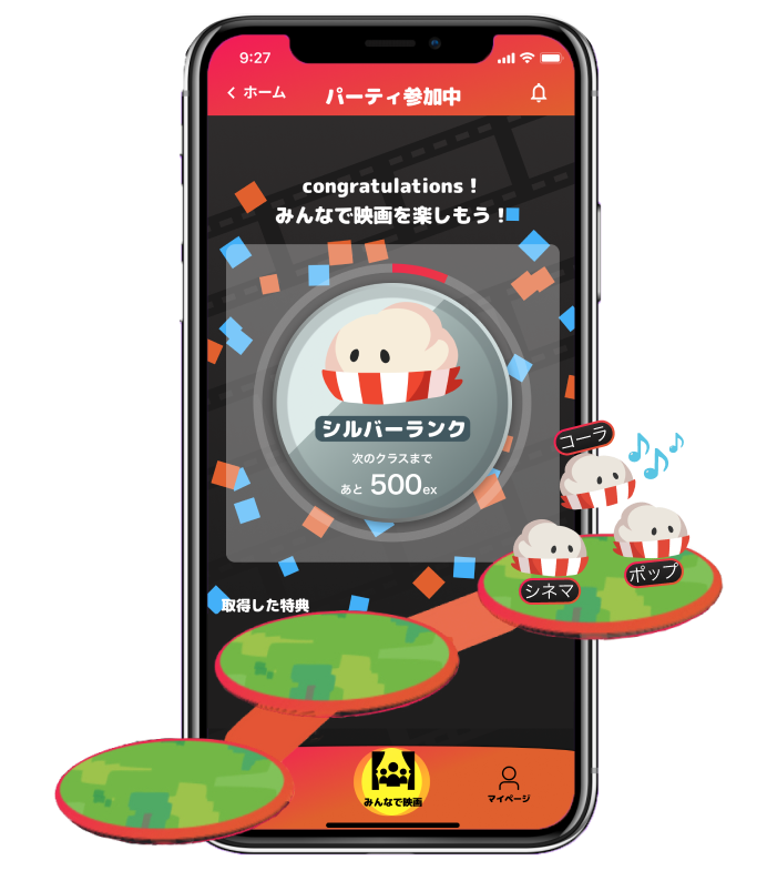 パーティーを組んで映画を見ると経験値がもらえる!一緒に見る人数が多いほど大きく経験値アップ。友達とたくさん映画を見に行こう。経験値が増えると自分のキャラクターの見た目が変化する…!